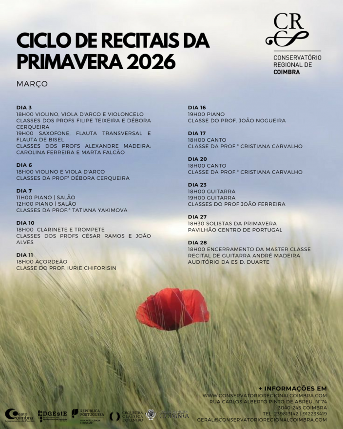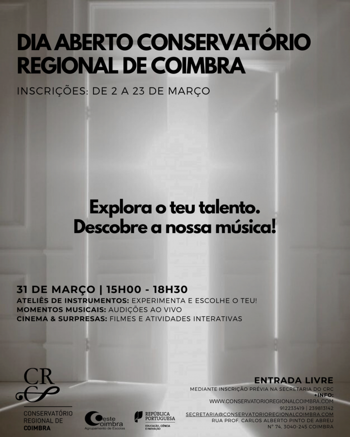 O Conservatório Regional de Coimbra é uma escola de Ensino Artístico Especializado de Música. Possui autonomia pedagógica e ministra cursos oficiais do 1º ciclo ao secundário. Na sua oferta formativa possibilita a frequência em regime articulado, com o Agrupamento de Escolas de Coimbra Oeste, em regime supletivo e em regime de curso livre. Celebrou contrato de patrocínio com o Ministério da Educação permitindo que os alunos frequentem estas valências com financiamento a 100% e em regime de cofinanciamento. Exerce a sua atividade desde 19 de outubro de 1934, sendo uma das mais antigas escolas do país a ministrar cursos oficiais de música. Vem conhecer‐nos!